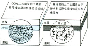 CGM 高強無收縮灌漿料的性能 摘要 依據大量的試驗成果,闡明 CGM 高強無收縮灌漿料是一種具有早強、高強、高流態、微膨脹和耐久性好等多種優點的新型復合材料。它是將流態混凝土、早強高強混凝土、膨脹混凝土和外加劑等多種混凝土技術綜合運用。 CGM high-strength non-shrinkage grouting material Abstract : Based on a great of experiment results, high-strength non-shrinkage grouting material is composite material which has many features including early-strength 、 high-strength 、 natural flow, micro-expansion. It is also a technology use of many concrete including natural flow concrete, early-strength and high-strength concrete, expansion concrete, admixture concrete and so on. 為了提高冶金、石化和電力等系統的軋鋼、連鑄、壓縮機、大功率泵和發電機等大型與特大型設備的安裝精度,加快安裝速度和延長設備使用壽命,需要采用流動度大、強度高和具膨脹特性的灌漿材料。這類材料不僅可用于大中型設備的地腳螺栓的錨固、墊板座漿的二次灌漿,也可用于梁柱接頭,工程搶修等具有早強、高強、無收縮和高流態要求的建筑施工。 表 1 產品主要性能