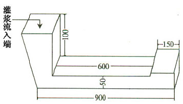 1.3 與設備底板的有效接觸面 有效承載接觸面 (EBA) 就是灌漿層的上表面與設備底板實際接觸的面積與設備底板面積之比,以百分比的形式表述。對于高性能灌漿料而言,也是極其重要的性能指標,直接反映灌漿料與設備基礎板接觸的程度,目前只有國外的個別供貨商 ( 如美國的五星公司 ) 提出這一個概念,國內剛剛認識到這一性能。若接觸面比較低,會造成應力集中,對設備的危害較大。 《耐化學腐蝕聚合物灌漿料的流動性和承載面積的試驗方法》 (ASTM C1339) ,給出聚合物灌漿料有效接觸面積的測定方法。參照此方法,我們自制船型模,見圖 3 所示,上鋼板尺寸 150 mm × 600 mm ,厚 10 mm ;上下鋼板間隙為 50mm 。將拌和好的灌漿料從一側倒人,直至從另一側溢出為止。 24h 后取下鋼板,觀察灌漿層上表面,與標準圖樣進行對比,確定有效承載接觸面。幾次的試驗結果表明,高性能灌漿料同兩家國外的產品的 EBA 都在 95 %以上,而國內的產品的有效接觸面都比較低。