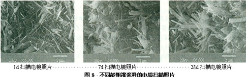 從表 3 可見,灌漿料早期強度增長迅速,隨著齡期延長,強度增長速度降低,但仍能持續穩定增長。實驗對不同齡期的材料進行了電鏡掃描分析,結果見圖 8 。