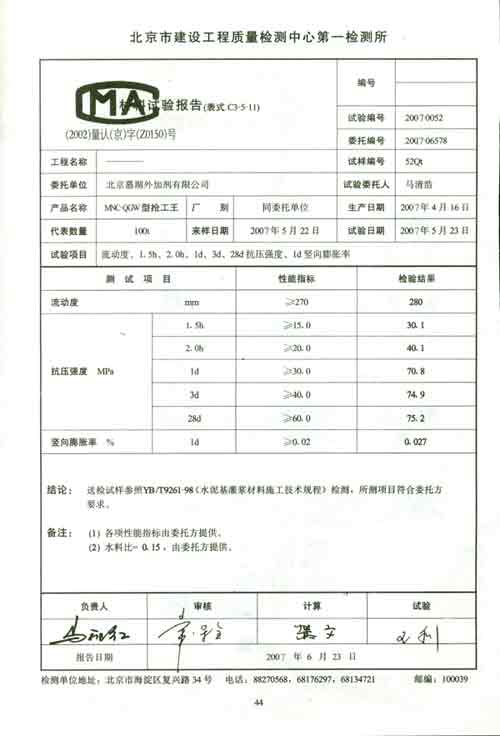 一、主要特點 2、大流動度、不泌水、不離析,保證施工更加簡便快捷,確保施工質量。 3、早強、高強、灌漿24h后確保設備正常運行生產, 在保證有足夠的施工時間( 30 ~ 60min )的前提下,自加水時算起 4h 混凝土強度就可滿足投入使用的要求(抗壓強度大于 30MPa ,抗折強度大于 4.5MPa )。這種既給施工以足夠的操作時間,又具備強度發展速度的快速修補材料,具有很強的實用性,適用于機場、高速公路、橋梁等重要混凝土路面的快速修補。 4 、不含金屬膨脹源,不腐蝕鋼筋,抗油滲,耐久性好。 二、應用范圍 1 、設備基礎及鋼結構柱腳底板二次灌漿; 2 、地腳螺栓錨固灌漿; 3 、鋼結構柱及混凝土柱杯口灌漿; 4 、混凝土結構改造和加固; 5 、后張預應力混凝土結構孔道灌漿; 6 、冬期施工灌漿;7 、高溫環境應用灌漿。 8 、水泥基灌漿材料 Cementitious Grout 道路人孔蓋高層調整;橋梁道路伸縮縫修補;剛性路面孔洞修補;機場跑道快速修補;電線桿的迅速固定;自來水管線搶修工程;工廠地坪快速修復;環氧等地坪前處理坑洞修補;其它土木工程需早凝早強的要求均可滿足。 三、技術指標