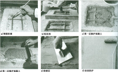 3 、施工注意事項(xiàng) (1) 清理基面,鑿除破損、松動(dòng)的混凝土,噴砂 ( 或用鋼刷 ) 除銹和油污,使外露鋼筋表面無(wú)銹蝕,且混凝土表面粗糙。 (2) 抹砂漿前 2 h ,用飲用水沖洗待修補(bǔ)部位,使混凝土表面處于飽和狀態(tài),但表面不能有明水。 (3) 人工修補(bǔ)時(shí),無(wú)論采用機(jī)械噴涂還是人工抹砂漿,應(yīng)朝一個(gè)方向使用抹刀,并且盡量一次抹完,避免來(lái)回抹。如修補(bǔ)厚度超過(guò) 3 cm 時(shí),應(yīng)分層抹,層與層之間應(yīng)間隔 3 ~ 4 h ,每層厚度不超過(guò) 2 cm 。 (4) 修補(bǔ)砂漿養(yǎng)護(hù) 48 h 后再涂混凝土防碳化劑。