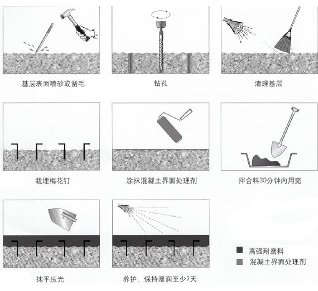 界面處理劑,基礎(chǔ)栽埋鋼筋網(wǎng),用鋼抹刀分層抹平壓光,同抹砂漿方式一樣,操作簡單 。 |
