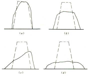 (a) 為無坍落度或坍落度很小; (b) 為有坍落度,用直尺測量其與坍落度筒頂部的高差,為坍落度值,如與設計值相符,便視為合格; (c) 則表示砂漿少、黏聚性差; (d) 如不是有意拌制大流動性混凝土,則可能坍落度過大。