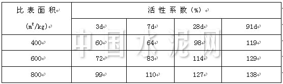 由表中可見,礦渣微粉的早期強度較低,而后其強度增進率較快。隨著比表面積的提高,其活性系數(強度比)相應明顯提高。當礦渣粉比表面積達到400m2/kg時,28天活性系數達98%,與水泥基本相當;而當礦渣粉比表面積達到或超過600~800m2/kg時,其28天活性系數達114~127%,高于一般比表面積(350m2/kg)水泥熟料的活性。