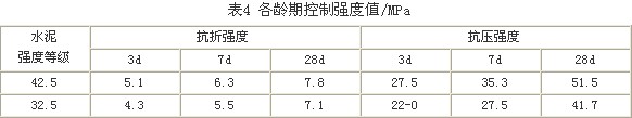 水泥強度等級的選用,應從混凝土試配強度、和易性、耐久性及經濟性等方面考慮。不宜用低標號水泥配制高強度等級混凝土,否則水泥用量大,混凝土收縮大,耐久性差;也不宜用高標號水泥配制低強度等級混凝土,否則水泥用量少,混凝土和易性和耐久性差,而要求增加水泥用量,會造成水泥浪費,成本提高。按照路面交通等級,道路混凝土設計的抗折強度一般在4.0~5.5 MPa之間。根據經驗,抗折強度設計等級為4.0~4.5 MPa時,應選用32.5級水泥;設計等級為5.0~5.5MPa時,應選用42.5級水泥。表4為道路水泥混凝土各齡期控制強度值。