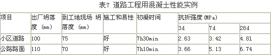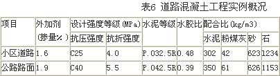 一般來說,對于廠區或小區的路面,其設計強度等級較低,對水泥的強度等級要求也低;而對于市政工程的道路建設,其設計強度等級較高,對水泥的強度等級要求較高。但道路混凝土工程有一個共性,就是通常對工期要求較短,以盡快保證道路暢通,因此常采用早強水泥。具體應用實例如表6所示: