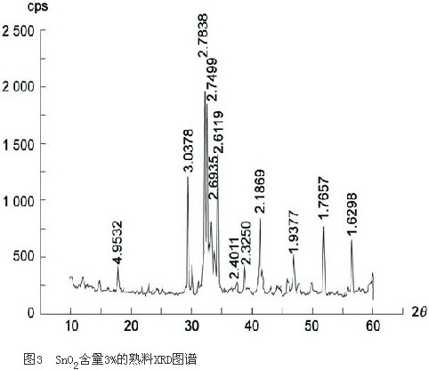 圖1是SnO2含量與熟料中fCaO含量及C3S理論形成率的關系曲線。從圖中可以看出,隨著SnO2含量的增加,1350℃煅燒的熟料中fCaO含量不斷下降,C3S的理論形成率(α)持續上升,說明SnO2對降低熟料中的fCaO有顯著作用。另外還發現,SnO2含量為0.2%~0.6%的區間為fCaO、α變化緩慢的區域,在SnO2含量為0~0.2%和0.6%~3.0%的區間內fCaO下降、α上升最快,但變化的原因卻大不相同。圖2是1350℃燒成、保溫30min的不同SnO2含量的熟料的XRD圖譜。圖中顯示,SnO2含量為0~0.6%的范圍內C3S的特征峰(d0=3.040)持續增強,表明少量的SnO2可以促進C3S的形成。但隨著含量的進一步提高,C3S的衍射峰強度不斷下降,這與前面用fCaO換算出的C3S含量上升結果不一致。這是由于熟料中Sn4+與Ca2+反應生成了新的礦物,奪取了與硅反應生成C3S的鈣資源,導致C3S含量下降。圖3是含SnO23.0%的熟料的XRD圖譜,圖中出現了d值為4.953的新的衍射峰,它就是錫酸鈣(2CaO·SnO2)的特征峰。結合圖1和圖2可以得出生料中SnO2的最佳含量為0.2%~0.6%。