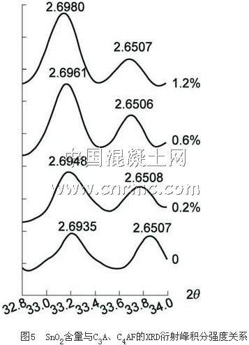 圖5是不同SnO2摻量的熟料中C3A和C4AF的XRD衍射峰積分強度對比曲線??梢钥闯?,隨著SnO2摻量的增加,C3A的XRD特征峰強度(d0=2.69)持續增強,表明在此范圍內,SnO2的摻入有利于熟料中C3A礦物的形成;同時,SnO2摻量增加,C3A的d值也逐漸增大(2.6935→2.6948→2.6961→2.6980),而熟料中的其它礦物的晶胞參數并沒有發生顯著變化,表明Sn4+固溶在C3A中。SnO2摻入后C3A的d值增大可以這樣解釋:Sn4+固溶進入C2A晶格,由于Sn4+的離子半徑(71pm)大于六配位Al3+的離子半徑(54pm),Sn4+取代Al3+形成C3Al1-xSnx固溶體造成鋁氧八面體晶格膨脹變形,晶胞變大,d值增加。