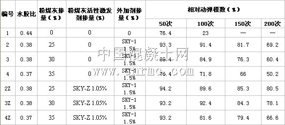 試驗用水泥為山水集團產P•O32.5級水泥;粉煤灰為鄒縣電廠Ⅰ級粉煤灰;細骨料為泰安中粗砂,細度模數(shù)3.10(中粗砂);粗骨料為濟南南部山區(qū)仲宮碎石,粒徑5~20mm;高效引氣減水劑采用山東省水利科學研究院技術開發(fā)部產SKY-1型外加劑,粉煤灰活性激發(fā)劑采用自制SKY-Z型。