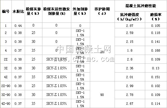 一般來說,混凝土的耐磨蝕性能與混凝土抗壓強度有很大關系,采用比較硬的集料和比較低的水膠比可以提高混凝土的耐磨蝕性能。粉煤灰顆粒較細,人們通常認為將其加入混凝土會降低混凝土的耐磨蝕性能。