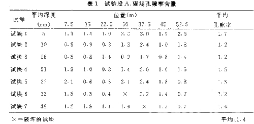 鉆取樣芯,做密度和空氣孔隙率試驗(yàn)。經(jīng)5天的冷卻周期后,沿試驗(yàn)段每7.5m為一段,如圖1a、b所示。(以同樣型式做非破壞性試驗(yàn))樣芯由大壩的頂部鉆取,約45cm深度。試樣頂部約2cm切去,剩余部分切成5cm的段,進(jìn)行空氣孔隙率試驗(yàn)。將試驗(yàn)塊從大壩頂部開始編號。