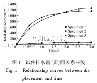 以不同方法澆注的混凝土試件排水量與時間關(guān)系曲線如圖1 所示. 由圖1 可見:方法1 (試件1) 采用18 mm 普通膠合模板澆注,由于施工工藝等原因,不能保證模板絕對密閉,使其有少量水排出,累計排水約65 mL ,隨著排水通道堵塞,2. 0 h 后不再有水排出;方法2 (試件2) 采用普通無紡布內(nèi)襯模板澆注,試件前期(0~2. 0 h) 排水強度較大,但由于水泥等固態(tài)顆粒堵塞無紡布排水通道,2. 5 h 后排水過程停止,累計排水約1 154 mL ;方法3 (試件3) 采用透水模板布內(nèi)襯模板澆注,整個排水過程由強變?nèi)?排水過程最長,持續(xù)3 h ,累計排水約1 264 mL . 排水量統(tǒng)計結(jié)果顯示試件2 ,3 排水量比試件1 要大得多,表明使用透水材料能排出混凝土中的多余水分,降低混凝土表面的水灰比,且透水模板布排水效果更為明顯;透水模板布后期排水強度有所減小,由于其吸水性和保水性,它仍能從混凝土內(nèi)部吸水,使其內(nèi)部富含水分,為提高混凝土的后期養(yǎng)護質(zhì)量提供了條件.