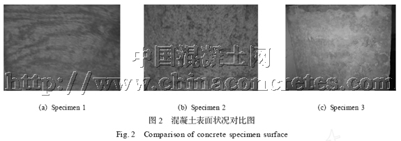 試件澆水養(yǎng)護7 d 后拆除模板. 拆模過程中,試件2 由于透漿嚴(yán)重,普通無紡布粘貼在混凝土表面而無法順利脫模,內(nèi)襯材料被撕裂;試件3 的透水模板布內(nèi)襯拆除后,質(zhì)量完好,仍可繼續(xù)使用. 究其原因,主要是透水模板布的各項強度及延伸率等力學(xué)指標(biāo)均比普通無紡布要高(見表1) ,能夠滿足施工過程中對內(nèi)襯材料抗撕裂等強度的要求. 因此,透水模板布較普通無紡布在混凝土施工中更具適用性. 拆模后混凝土表面狀況如圖2 所示.