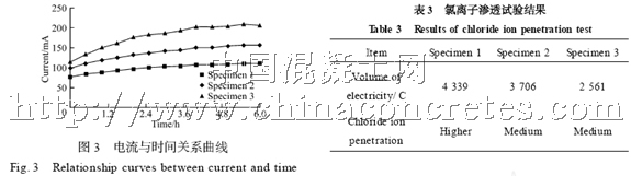 混凝土的導(dǎo)電性可以反映其內(nèi)部孔隙結(jié)構(gòu),從而反映混凝土的滲透性[10 ,11 ] . 依據(jù)氯離子滲透試驗結(jié)果可知,試件1 的氯離子滲透性為高,試件2 ,3 為中.