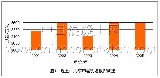 據統計,2005年北京市建筑垃圾排放量達3600萬噸,平均每日排放10萬噸。按北京市常住人口1800萬人口計算,人均排放建筑垃圾約2噸/年,遠遠超出我國人均排放建筑垃圾0.5噸/年的平均水平,是發達國家人均排放約0.3噸/年的7倍。截至2005年,我國建筑垃圾年排放量為4億噸,是世界建筑垃圾排放最多的國家,北京又以占全國建筑垃圾9%的份量位居第一,而且近年來北京市建筑垃圾年均排放量一直維持在這種高水平。近五年排放量見圖1。