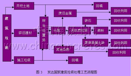 北京市建筑垃圾處置工藝簡單劃一,按線性模式操作。與之不同,國外在處理建筑垃圾的過程中完全是按循環模式操作,所有被回收利用的垃圾可以被作為再生資源應用于建筑場合,真正實現了變廢為寶。見圖2和圖3: