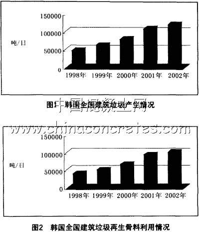 以韓國為例,韓國建筑垃圾產生量1998年為47693噸/日,2002年為120141噸/日。建筑垃圾再生骨料占建筑垃圾的百分~1998年為76.6%,2002年為83.4%,循環利用的年平均增加率為26.1%(見圖1和圖2)。可見韓國建筑垃圾的產生及再生利用量正在逐年增加,再生利用率也在逐年提高。