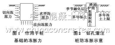 樁基在使用過程中由于凍土季節的變化將產生凍脹力。根據凍脹力作用于基礎表面的部位和方向,可劃分為3種:切向凍脹力、水平凍脹力和法向凍脹力(見圖 1)。水平凍脹力相互抵消,對工程造成破壞的主要是凍脹產生的切向力和法向力。在工程建設中,采取以下措施可以防止樁基礎凍脹:①為避免樁基礎受到法向凍脹力,將樁基礎嵌入多年凍土天然上限以下一定深度;②將鋼制擴筒埋入多年凍土上限以下至少0.5m,護筒內徑比樁徑大10cm,并于護筒外圍涂渣油,成樁后不拆除護筒,減少外表面的親水程度;③盡量采用高樁承臺,凍脹嚴重地區采用鉆孔擴底樁;④在護筒外側、低樁承臺底部采用渣油拌制粗顆粒土回填。以上措施能有效地減小切向凍脹力,降低凍土對護筒的上拔凍脹力(見圖2);⑤鉆孔采用旋挖鉆機干法成孔保證孔位置正確和鉆孔的垂直度;⑥采用低溫早強耐久混凝土,避免了混凝土低溫澆筑帶來的強度增長慢的問題。