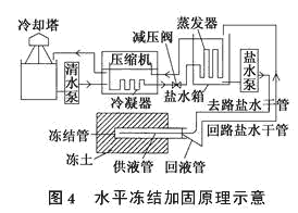 在實際施工中,通過水平鉆進凍結孔,設置冷凍管,并利用鹽水為熱傳導媒介進行凍結。一般是在工地現場內設置凍結設備,冷卻不凍液(一般為鹽水)至-22~-32℃。其主要特點有: