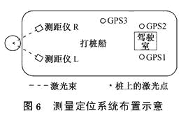 安裝在打樁船上的3個GPS接收機接收建立在陸地的基準站及海中參考站發射的固定頻率數據鏈,以此作為定位的基準數據。其工作原理:定位時,由固定在打樁船上的GPS流動站以RTK方式控制船體的位置、方向和姿態,同時配合2臺固定在船上的免棱鏡測距儀測定樁身在一定標高上的相對于船體樁架的位置,由此可推算出樁身在設計標高上的實際位置,并顯示在系統計算機屏幕上。通過與設計坐標比較,進行移船糾位,直至偏位滿足要求。樁身的傾斜坡度由樁架控制。樁頂標高根據由免棱鏡測距儀發出的紅色水平光束所指涂畫在樁身上的刻度,通過系統計算得出。具體定位前,將所要定位樁的設計中心坐標、高程、平面扭角等參數輸入計算機內,定位時,可在顯示屏上顯示實時樁位數據與圖形,同時也顯示設計沉樁位置和偏差,打樁船指揮人員根據顯示的有關信息指揮打樁船正確就位。