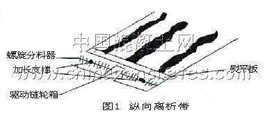 大量的試驗(yàn)以及攤鋪實(shí)踐都表明,縱向離析現(xiàn)象是由螺旋分料器結(jié)構(gòu)產(chǎn)生,如圖1所示。
