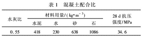 本試驗采用拉法基P·O42.5R水泥;細集料為細度模數為2.7的中砂,表觀密度為2.52g/cm3,顆粒級配良好;粗集料為石灰巖碎石,5mm~10mm連續級配,表觀密度為2.71g/cm3;脫模劑為肥皂水。混凝土配合比及其28d強度見表1。混凝土采用強制式攪拌機攪拌,機械振動,鋼模成型,新拌混凝土具有較好的和易性,坍落度為55mm。試件振動密實后,在其表面覆蓋塑料薄膜,24h后脫模,標準養護。