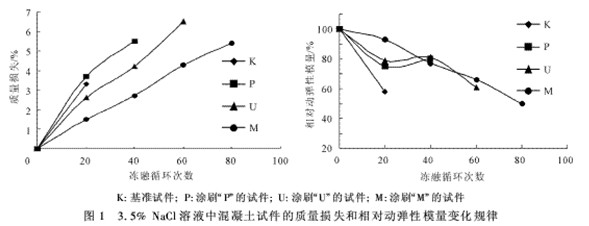 圖1為不同類型的混凝土試件在3.5%NaCl溶液中進行凍融循環時的質量損失和相對動彈性模量變化規律。