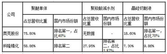 據記者梳理相關數據顯示,兩家上市公司主營業務基本雷同,但奧克股份生產的聚醚單體以及晶硅切割液市場占有均領先于科隆精化。
