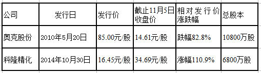表格2:科隆精化與奧克股份公開發行股票相關數據