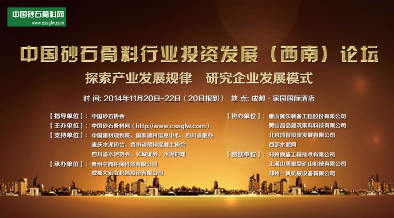 由中國砂石協會指導、中國砂石骨料網(http://www.cssglw.com/)主辦、貴州中鼎環保科技有限公司和成都大宏立機器股份有限公司承辦的首屆“中國砂石骨料行業投資發展(西南)論壇”將于11月20日-22日在成都家園國際酒店召開。本次論壇得到了中國建材規劃院、國家建材信息中心、四川省散辦、重慶水泥協會、貴州省預拌混凝土協會、四川省水泥協會、長城證券、水泥地理等單位的大力支持,也得到了上海山美重型礦山機械有限公司和鄭州鼎盛工程技術有限公司的支持。