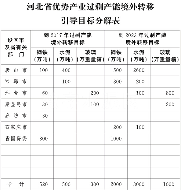 近日,河北省下發(fā)了《河北省鋼鐵水泥玻璃等優(yōu)勢(shì)產(chǎn)業(yè)過(guò)剩產(chǎn)能境外轉(zhuǎn)移工作推進(jìn)方案》(以下簡(jiǎn)稱(chēng)“方案”),該方案的目的是,鼓勵(lì)水泥等優(yōu)勢(shì)產(chǎn)業(yè)過(guò)剩產(chǎn)能向境外轉(zhuǎn)移,開(kāi)拓國(guó)際發(fā)展空間,變過(guò)剩產(chǎn)能為有效產(chǎn)能,促進(jìn)河北省產(chǎn)業(yè)結(jié)構(gòu)調(diào)整和轉(zhuǎn)型升級(jí),并針對(duì)性的分配了目標(biāo)任務(wù),要求水泥產(chǎn)能到2017年實(shí)現(xiàn)境外轉(zhuǎn)移的目標(biāo)為500萬(wàn)噸,以及2018年到2023年平均每年都要實(shí)現(xiàn)500萬(wàn)噸的轉(zhuǎn)移目標(biāo)。其中還規(guī)定了以非洲、東南亞、南美和中東歐國(guó)家及地區(qū)為重點(diǎn),發(fā)揮河北省水泥企業(yè)技術(shù)、裝備、設(shè)計(jì)、工程建設(shè)等方面的綜合優(yōu)勢(shì),建立境外水泥生產(chǎn)基地,滿足當(dāng)?shù)厥袌?chǎng)需求,擴(kuò)大國(guó)際市場(chǎng)份額。