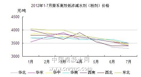 以萘系高效低濃減水劑(粉劑)為例,由中國混凝土網數據顯示,今年的1月、2月一直保持著11年年末的價格。3月,隨著氣溫的變暖以及工業萘的小幅上漲,各地區減水劑價格也一起水漲船高,雖然漲幅僅在150元-200元/噸之內,但對于開春后的盤整階段來說,已經是個不小的喜訊。可惜好景不長,4月,由于資金回款難,終端房地產的低迷市場等原因,減水劑市場一直維持著弱勢盤整狀態。到了5月,減水劑市場幾乎全面崩潰,各地區紛紛跌價,跌幅在200元-300元/噸,企業對市場走勢較為悲觀,開工率不到5成。再加上商品混凝土銷售量的不景氣,對市場又是一個不小的打擊。6月,雖然部分地區價格有些許回升,但是仍然對市場起不了帶動效果,并且,市場價格一直處于低位運行的狀態。