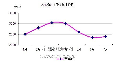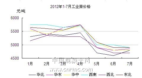 2012年上半年以來,工業萘的形勢萎靡不振,究其原因,還要從其原料——煤焦油說起。從圖中可以看到,今年的1月至3月,由于國際原油的高位持穩,石油燃料油價位高,帶動了煤焦油的持續上漲。在這一利好情況下,工業萘倒也“風光”了一段時間。到了4月,受深加工傳統檢修影響,煤焦油價格開始下滑;5月,忍受不了庫存壓力的商家們紛紛向下降價,即使是采用了限產的手段,到了6月,煤焦油市場仍然沒有起色。這也導致了工業萘在之后的3個月內同樣的慘淡,甚至在6月,出現了各區域的暴跌,跌幅最大的甚至達到了800元/噸。預計工業萘市場在短期內受煤焦油影響,很難有大的起色。