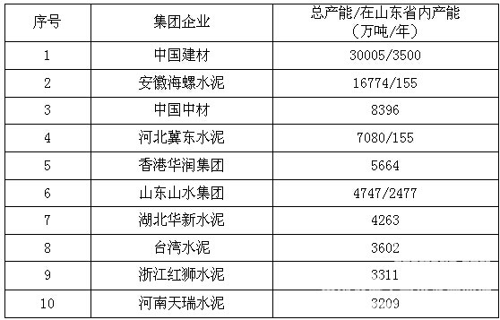 國內前10家大企業集團的水泥熟料產能占全國總產能的53%,其中山水集團位居全國第6位。