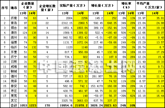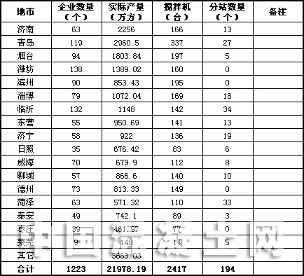 山東省2014年17地市預拌混凝土生產企業及產量統計對比表