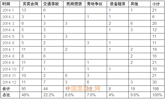 2015年1月,北京市高級人民法院院長在北京市第十四屆人民代表大會第三次會議上報告說“全市法院2014年全年收案465106件,同比上升10.6%,結案448246件,同比上升10.9%,收案、結案數量均達到歷史新高。”根據公開數據顯示,2015年已經過去的前三個月,北京市各級人民法院已經收案17萬余件,法院的收案、結案數量仍在不斷攀升,官司越來越多了。在全部訴訟案件中,混凝土企業參與訴訟的情況如何呢?恐怕任何企業都不想宣揚打官司的情況,要想了解混凝土行業企業整體的訴訟情況更加困難。好在,為了推行審判公開的司法改革要求,人民法院的判決書、裁定書正在逐步上網公開。“北京法院審判信息網”上已經公開的2014年全市各級人民法院判決書、裁定書共約11萬份,雖然不是全部公開,但是公開的尺度還是很大的。筆者對于其中混凝土企業作為訴訟參加人的判決書、裁定書進行了梳理,并且按照案由類型分類統計(見附表),總結分析混凝土企業參與訴訟的特點,從中找出規律,希望能夠對于混凝土行業企業經營管理中法律風險防范工作有所啟發。