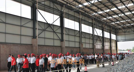 觀摩這條生產線是研討會的重要內容之一。華基公司實施的這條綠色混凝土集成化生產線在全國范圍內屬于首創,一舉實現了“零污染”“零排放”。