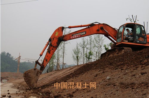 在防洪堤上作業的挖土機