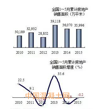 新開工面積下降的幅度較土地購置面積要晚和慢一些,2012年開始出現負增長,2013年略有微彈,2014、2015年都是兩位數負增長。這表明房地產為刺激市場銷售,大幅度降低新房的供給量,放緩新開工面積的速度。2015年1~5月的新開工的面積較2013年下降30%多。在和房地產、商混產業交流時,認為這一趨勢將會持續。