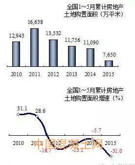 首先看房地產土地購置面積指標,2011年是高峰,隨后一路快速下降,2012年以來一直負增長,盡管2014年略有反彈,但仍是負增長,2015年1~5月的土地購置面積增速更是大幅度下跌。土地購置面積這一先行指標表明,在房地產存量沒有明顯改善情況下,這一趨勢是繼續下行。