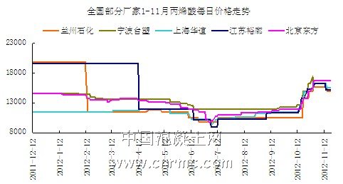 9月底,日本觸媒公司的丙烯酸儲罐爆炸事件對該行業影響巨大,導致國內的丙烯酸價格一路飆漲。美國得克薩斯州的一座丙烯酸化工廠繼日本觸媒丙烯酸裝置發生爆炸停產之后又發生火災。這使得本已吃緊的丙烯酸市場更加風聲鶴唳。這一事件對當前因日本觸媒裝置爆炸引發的全球丙烯酸市場緊張局面無疑是雪上加霜,對國際丙烯酸價格也會帶來推動。僅一個月內,國內丙烯酸價格上漲了40%,達到年內新高點,造成價格高企,下游接貨不暢。但好景并不長,11-12月為丙烯酸傳統銷售淡季,所以市場冷清且缺乏交投興趣,截至11月中旬,丙烯酸價格出現大幅下跌。目前買家已離場觀望,整體成交氣氛低迷,經銷商出貨困難。