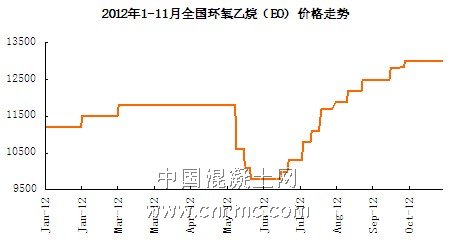2012年末將至,環氧乙烷市場行情稍顯平淡。自今年暴漲暴跌一番之后,環氧乙烷市場似乎進入了平臺期。本月十八大的召開,對環氧乙烷市場產生較大影響,北方部分環氧乙烷工廠停工,商家也在此期間進行設備檢修,無力經營。從十月中下旬至今,成交清淡,價格盤穩運行。目前均價維持在13000元/噸附近。直至十八大閉幕,環氧乙烷價格也并未出現反彈。