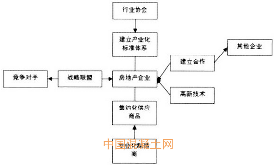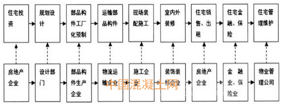 住宅產業中進行房地產開發與經營的房地產企業,進行規劃設計的設計部門,部品構件的研發生產企業,提供專業物流運輸的物流行業,從事現場裝配施工的施工行業,進行室內外裝修的裝飾裝修企業,為住宅消費者或投資者提供資金和相關信用服務的金融行業,為住宅提供保險服務的保險行業,以及對住宅產品進行管理維護的物業管理公司等,共同圍繞住宅這個最終產品,各自從事專業化的工作,根據不同的工作性質分布于產業鏈的上下游,由此形成了住宅產業鏈。