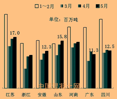 中部地區固定資產投資主要集中在河北、河南、湖南三省,前5個月投資增幅分別為24.1%、170.4%、44.9%;東部地區主要集中在江蘇、浙江、福建等水泥產業大省,三省累計投資分別增長29.7%、79.2%、29.3%,西部地區只有陜西、新疆同比增長,增幅分別為16.3%和50.9%。這些地區固定資產投資的增長,除用于技術提升改造和環保設備投入外,水泥企業集團向商品混凝土等產業鏈下游產業發展現象明顯。