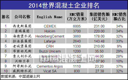 根據中國混凝土網的統計數據,2014年世界混凝土十強排名如下: