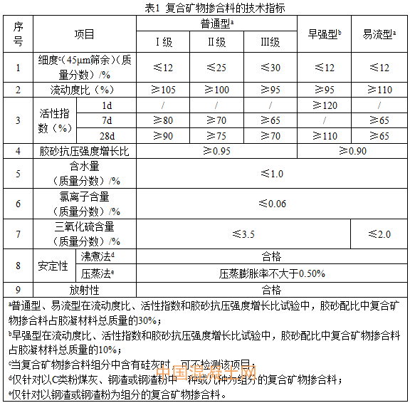 礦物摻合料是高性能混凝土的重要組分之一。復(fù)合化是礦物摻合料發(fā)展的必然趨勢,是解決目前局部地區(qū)資源供給困難,同時(shí)提升礦物摻合料利用水平的有效措施。為規(guī)范復(fù)合礦物摻合料的生產(chǎn)與檢驗(yàn),保證混凝土質(zhì)量,中國建筑科學(xué)研究院會同相關(guān)單位制訂了《混凝土用復(fù)合摻合料》。該標(biāo)準(zhǔn)規(guī)定了混凝土用復(fù)合礦物摻合料的術(shù)語和定義、組分與材料、分類與標(biāo)記、要求、試驗(yàn)方法、檢驗(yàn)規(guī)則、標(biāo)志、包裝、運(yùn)輸與貯存,并將復(fù)合礦物摻合料劃分為普通型、早強(qiáng)型及易流型,首次提出膠砂抗壓強(qiáng)度增長比這一技術(shù)指標(biāo)及對應(yīng)的測定方法,將摻合料的性能指標(biāo)試驗(yàn)齡期推延到90天。