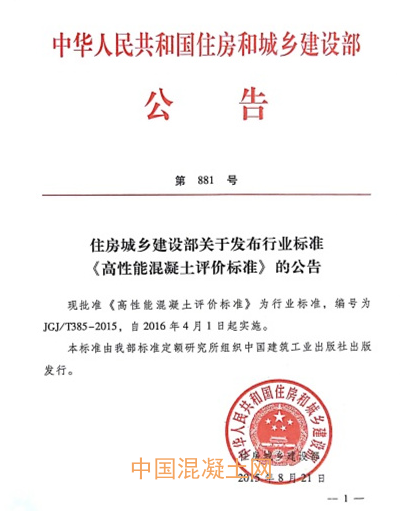 8月21日,住房城鄉(xiāng)建設(shè)部發(fā)布公告,批準(zhǔn)《高性能混凝土評價(jià)標(biāo)準(zhǔn)》為行業(yè)標(biāo)準(zhǔn),編號為JGJ/T385-2015;批準(zhǔn)《混凝土用復(fù)合摻合料》為建筑工業(yè)行業(yè)產(chǎn)品標(biāo)準(zhǔn),編號為JG/T486-2015。兩部標(biāo)準(zhǔn)自2016年4月1日起實(shí)施。