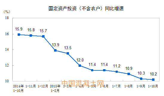 2015年1-10月份,全國固定資產投資(不含農戶)447425億元,同比名義增長10.2%,增速比1-9月份回落0.1個百分點。從環比速度看,10月份固定資產投資(不含農戶)增長0.72%。