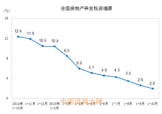 2015年1-10月份,全國房地產開發投資78801億元,同比名義增長2.0%,增速比1-9月份回落0.6個百分點。其中,住宅投資53150億元,增長1.3%,增速回落0.4個百分點。住宅投資占房地產開發投資的比重為67.4%。