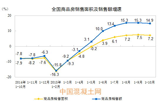 1-10月份,商品房銷售面積94898萬平方米,同比增長7.2%,增速比1-9月份回落0.3個百分點。其中,住宅銷售面積增長7.9%,辦公樓銷售面積增長13.4%,商業營業用房銷售面積增長1.5%。商品房銷售額64790億元,增長14.9%,增速回落0.4個百分點。其中,住宅銷售額增長18.0%,辦公樓銷售額增長19.2%,商業營業用房銷售額下降2.2%。